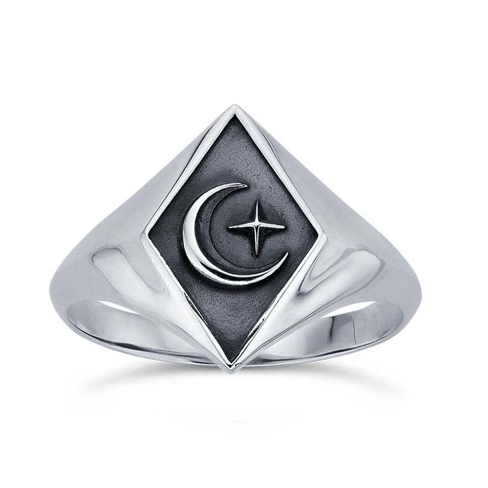 Sterling Silver Diamond-Shaped Signet Ring with Moon & Star