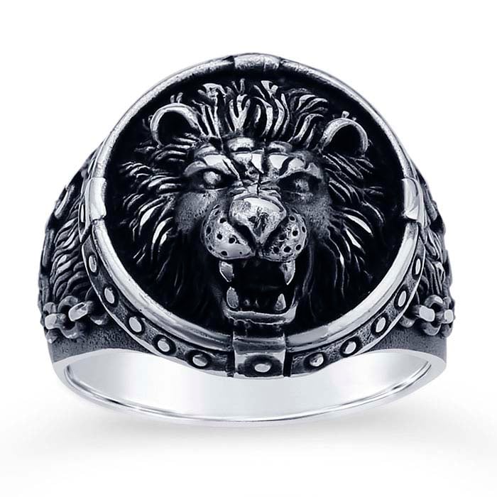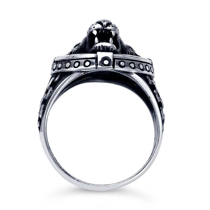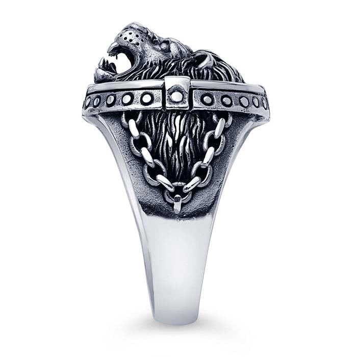 Sterling Silver Lion's Head Ring with Chain & Stud Accents